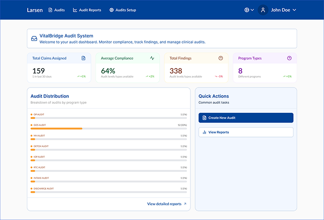 Schedule a live demo and discover how Larsen helps you manage audit sessions, track compliance rates, organize patient records, and generate reports with ease. Our team will walk you through the platform, answer your questions, and show you how to tailor it to your organization’s needs.
